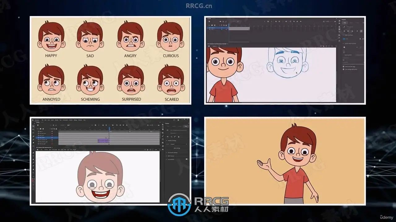 接下来,我们将学习角色动画。您将学习如何从零开始创建角色并制作动画,包括角色矢量化、装配和面部表情动画。深入学习角色表演,掌握唇部同步、眨眼和绘制不同唇形的技巧。