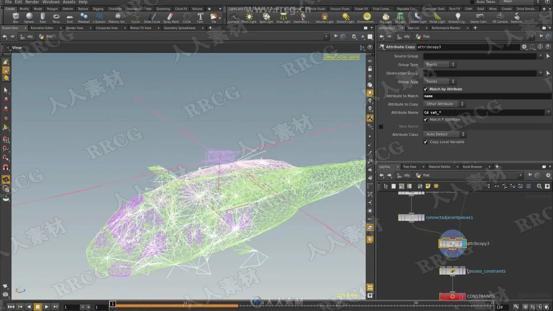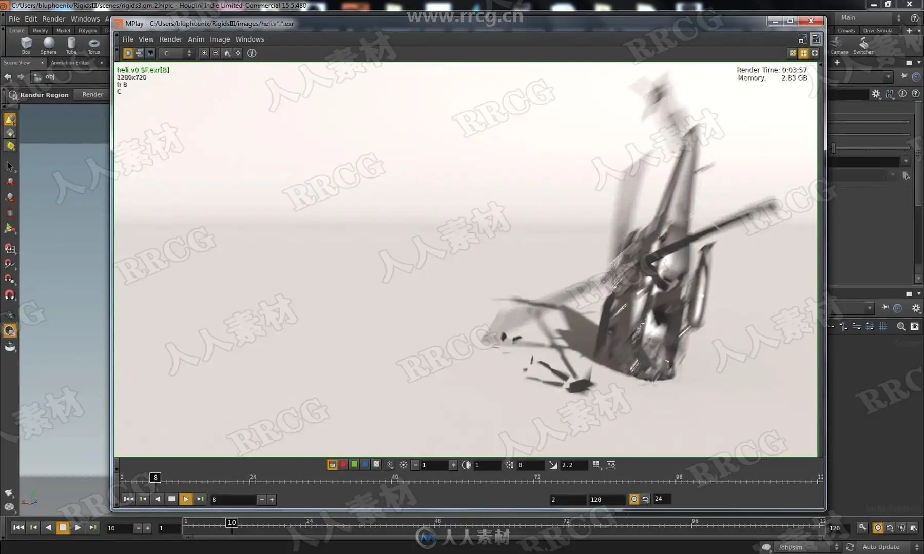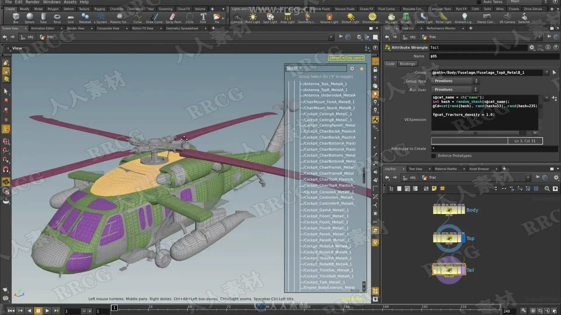 In Rigids III we will tackle the complex task of destroying a vehicle! Included with the lesson is a high resolution helicopter that we will smash into the ground. We talk extensively about the mysterious “hard” and “cone twist” constraints, as well as strategies to combine them with the “glue” constraint in order to achieve the looks of different physical materials under stress. Perhaps most importantly, an efficient workflow is described in order to keep this complexity manageable as well as art directable. As a bonus, we will also render our final work in Mantra as well as export to the Alembic file format in order to read into other packages if we desire.