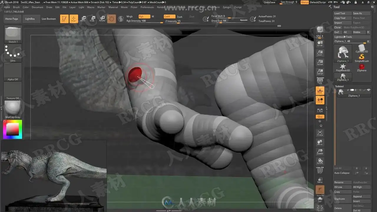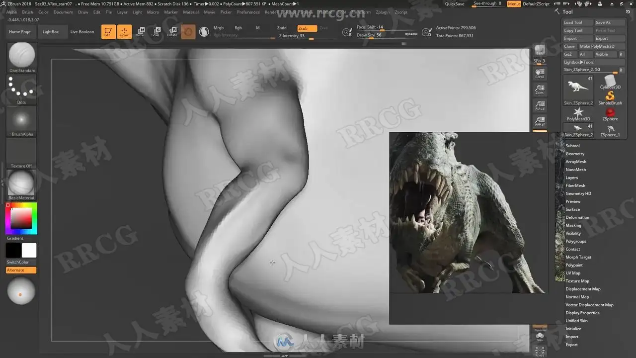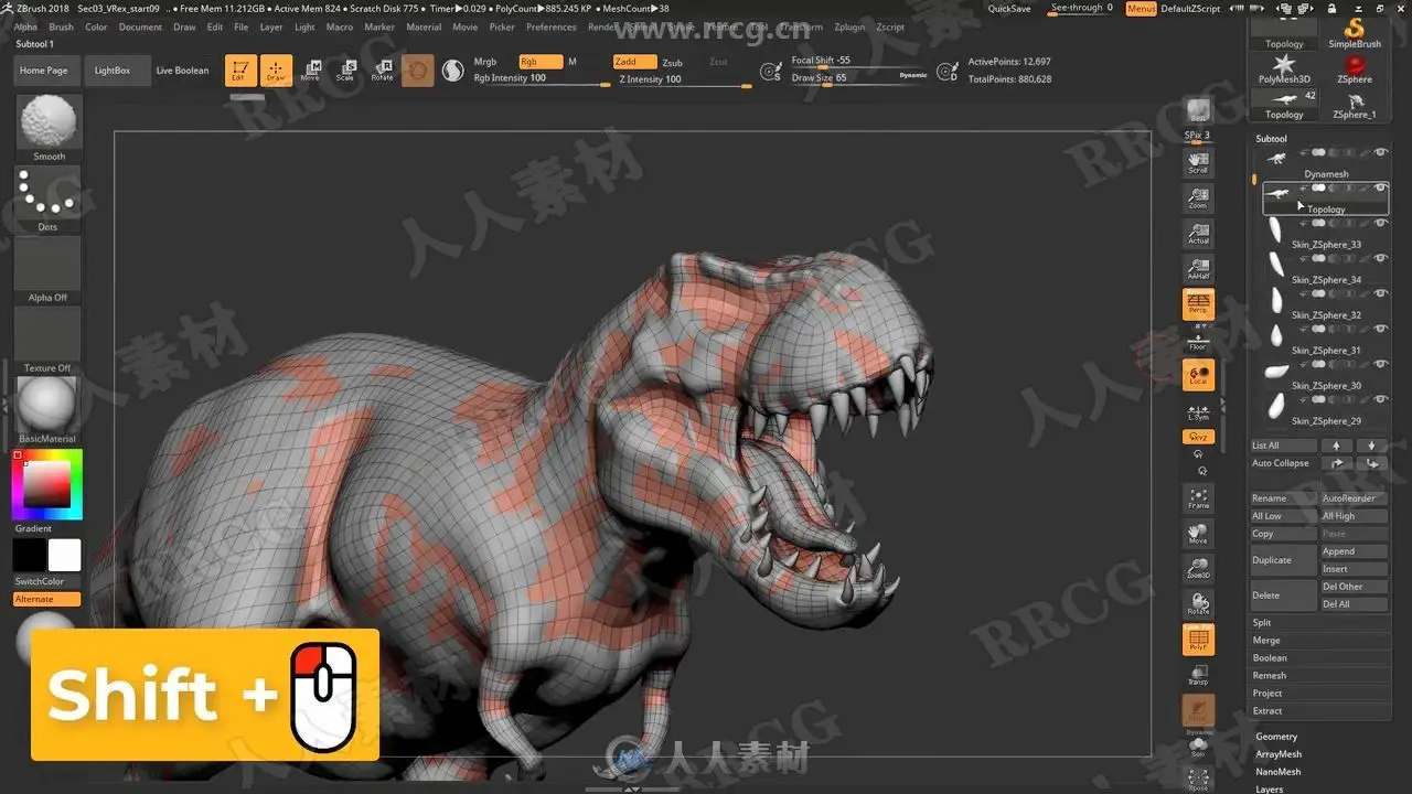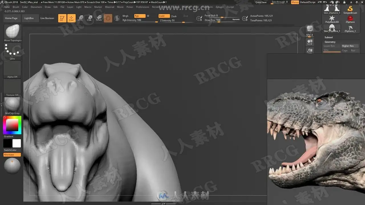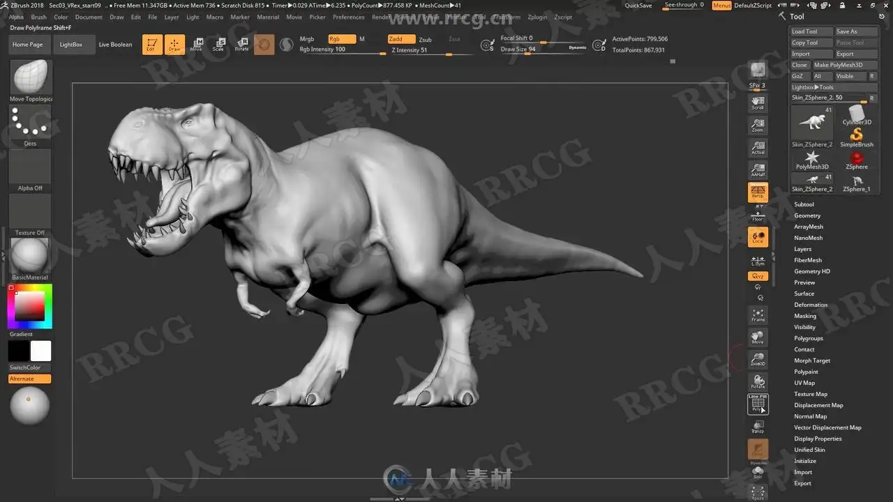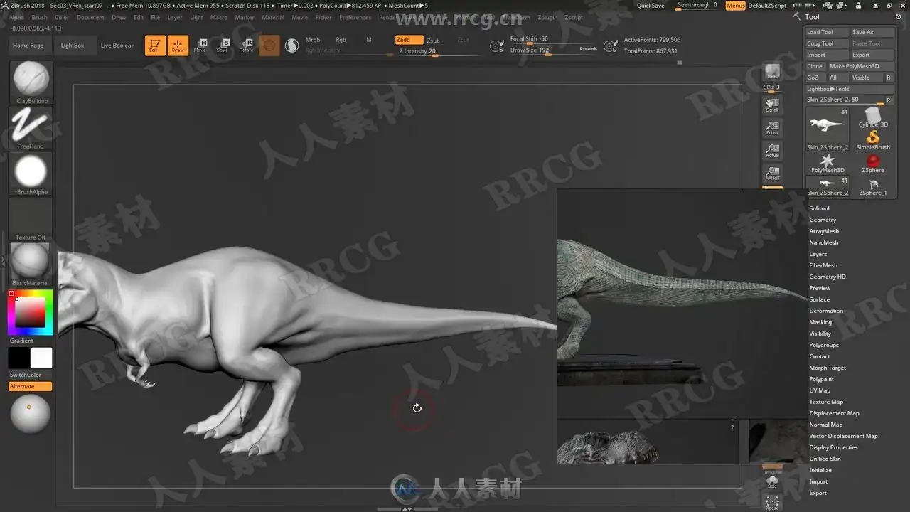 本教程是关于Zbrush恐龙模型雕刻视频教程,时长:4小时22分钟,大小:1.6 GB,MP4高清视频格式,教程使用软件:Zbrush,附源文件,共23个章节,语言:英语。