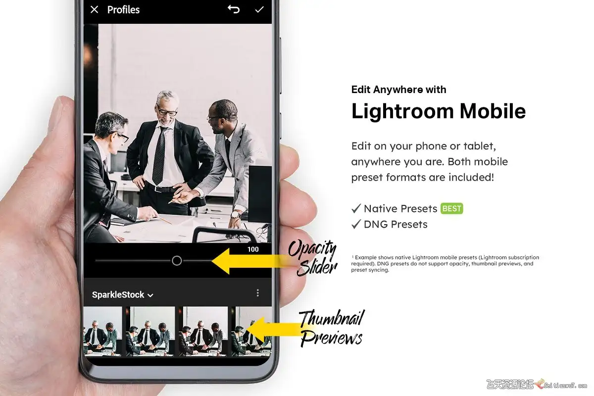 通过在手机上进行编辑来减少停机时间。这些预设具有TRUE Lightroom Mobile支持。您将获得两种移动预设格式,以实现最终兼容性。通过免费的Lightroom Mobile应用程序使用DNG预设。如果您有付费版本,请使用本机预设解锁不透明度支持。