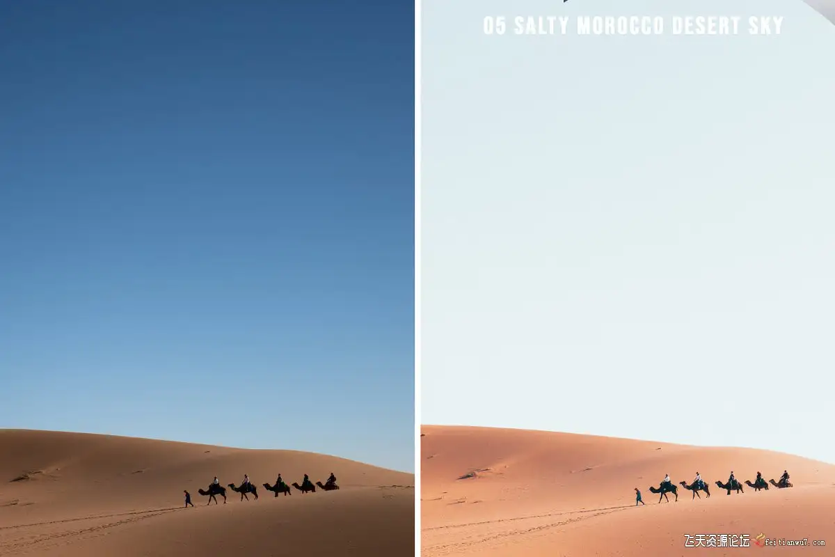 05咸摩洛哥经典-沙漠天空|受到摩洛哥沙丘和沙漠的启发。给闪闪发光的沙子带来淡淡的橙金色,使其几乎像一幅画。在05沙漠预设中,天空中仍带有淡淡的蓝色,而该颜色则呈现出更多的颜色,仅集中在沙丘上。