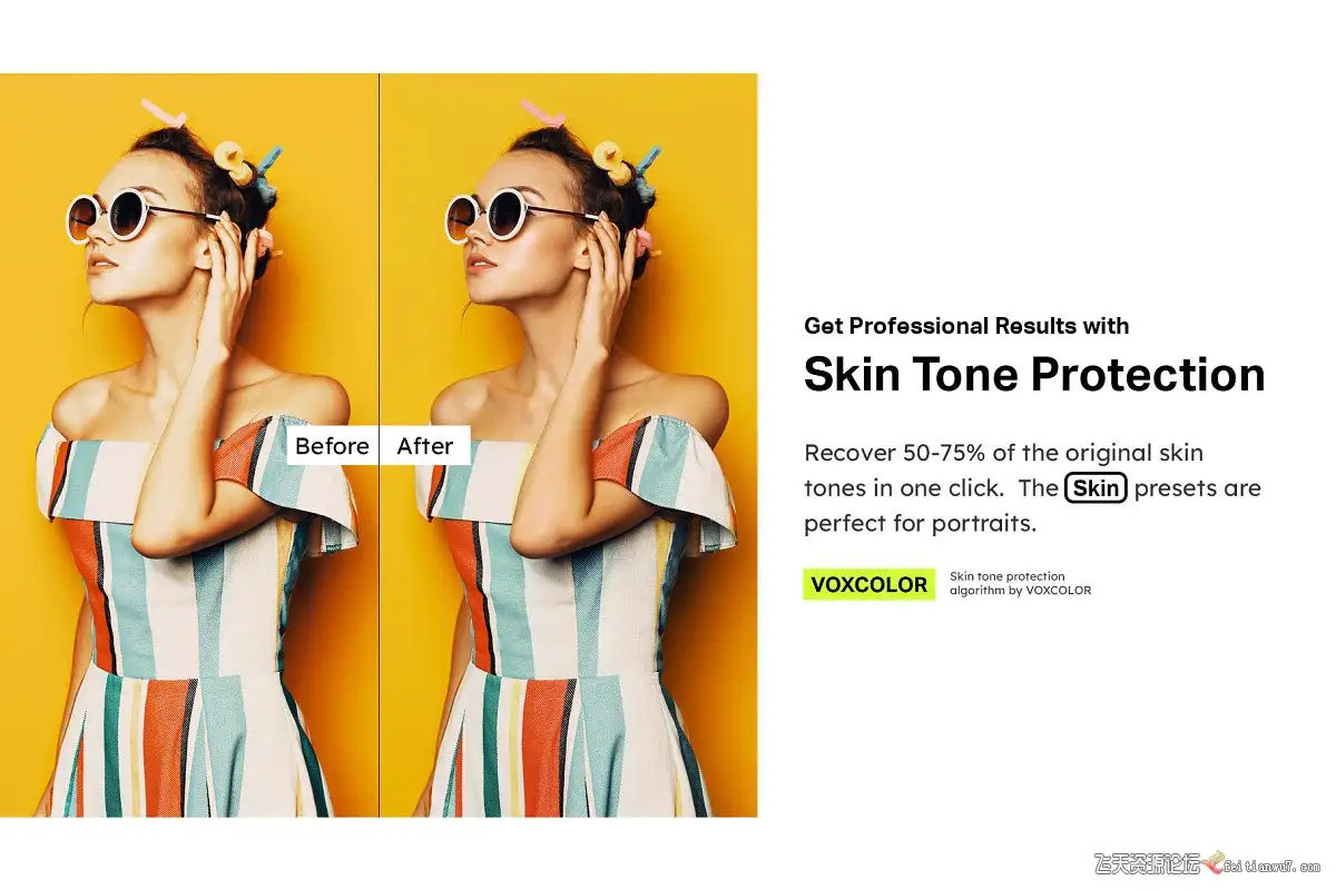 轻柔呵护肤色,轻松获得专业效果。特殊的皮肤预设可还原原始肤色的50-75%,而无需插件,遮罩或额外的工作。在普通和皮肤预设之间切换时,您会看到立即的差异