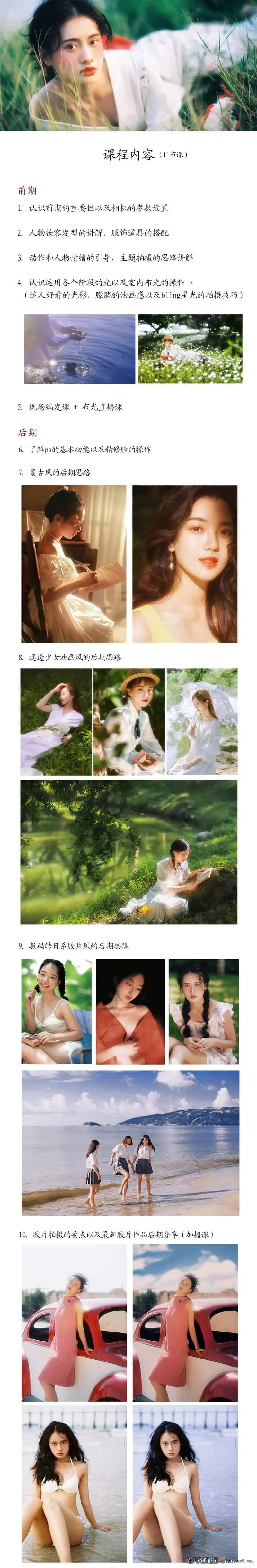 包含:前期拍摄课、复古调色课、精修人脸课、通透绿调色课、搭配课等港风人像摄影教程