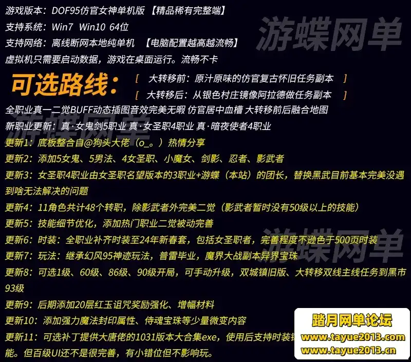 更新11:可选补丁提供大唐佬的1031版本大合集exe,使用后支持时装能。但百级U还不是很完善,有小错位但不影响玩。