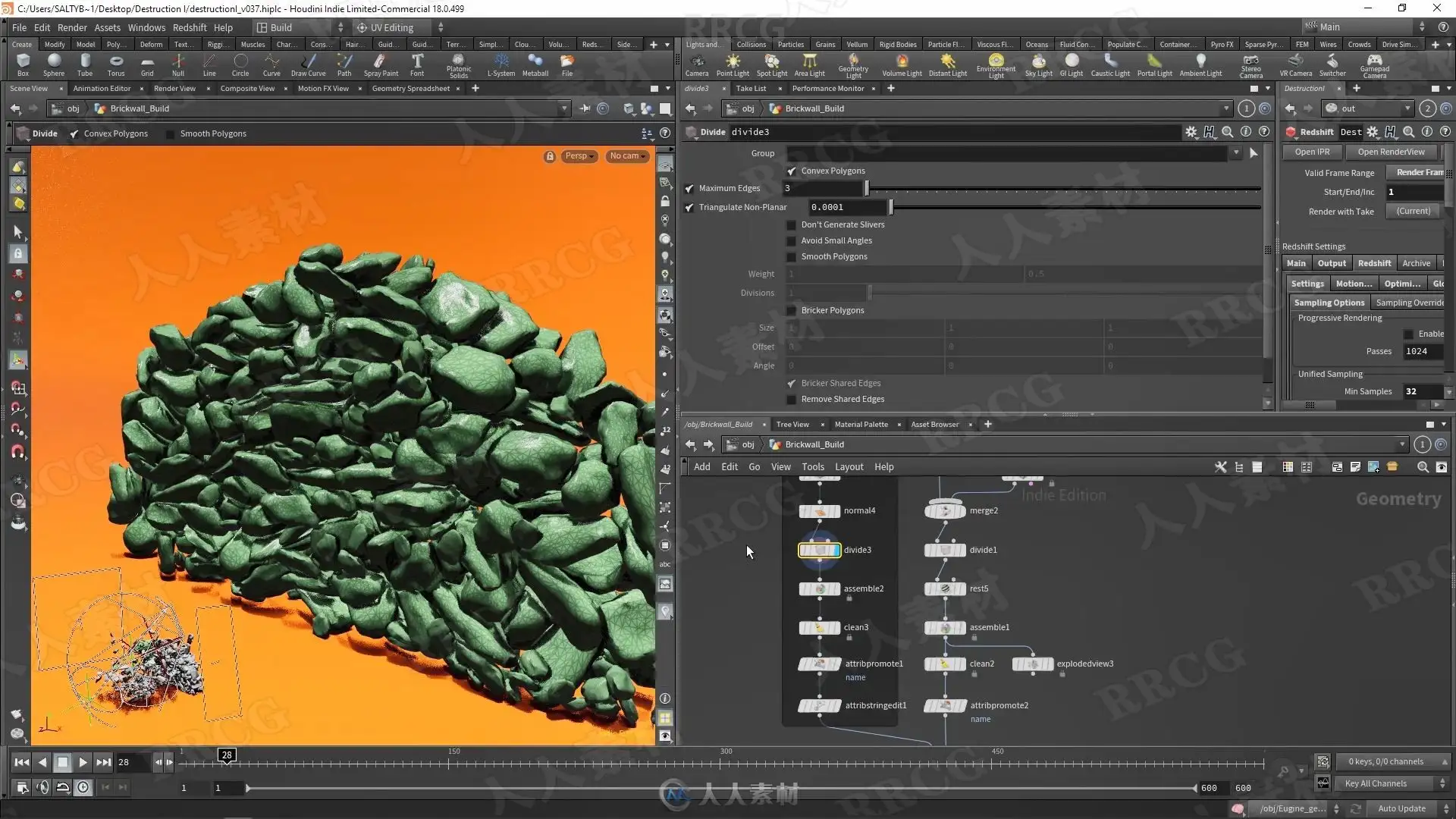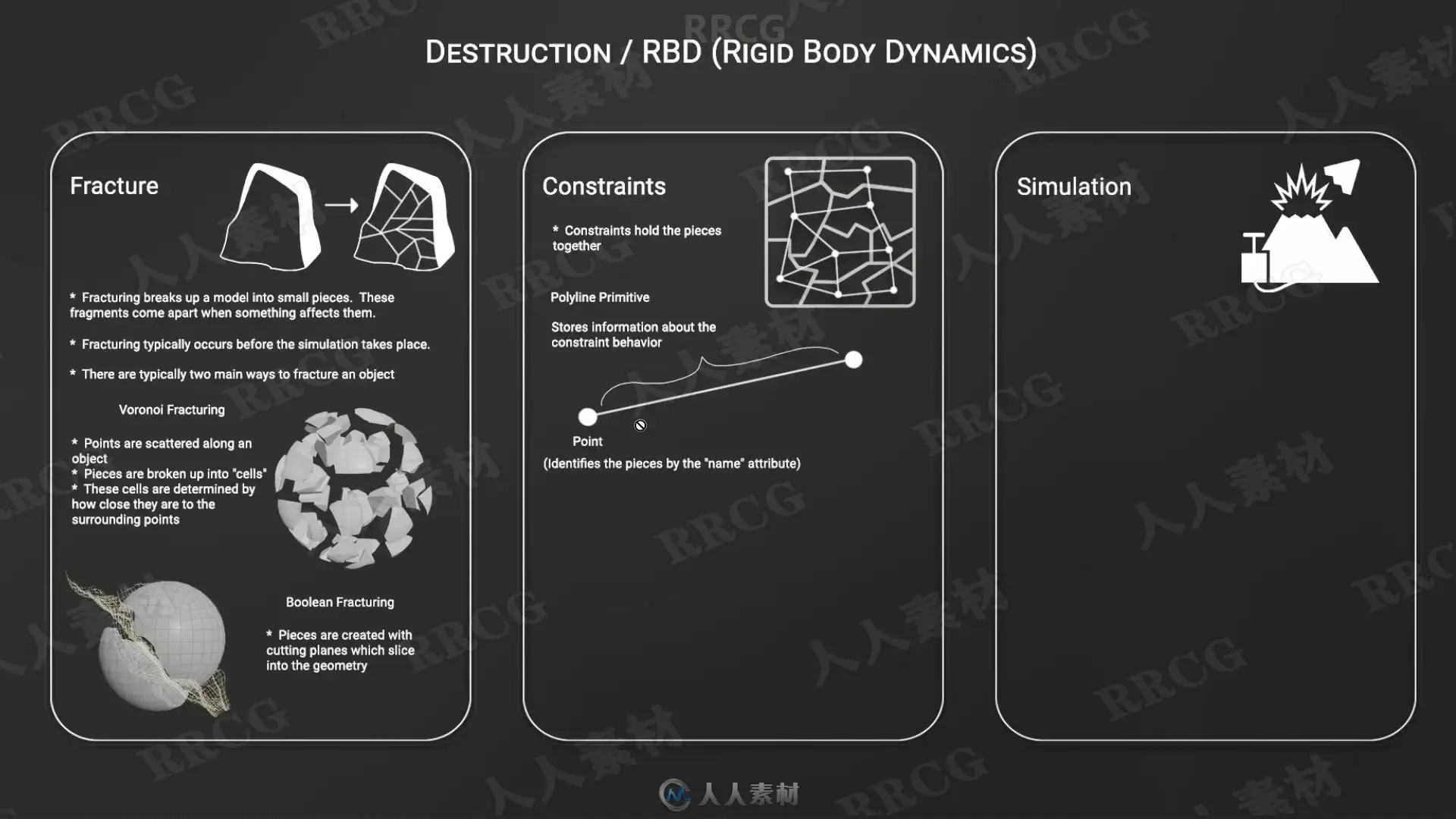 More specifically, this includes: Analyzing collision meshes, understanding packed primitives, RBD packed primitives, the differences between solvers, understanding how constraints work, voronoi fracturing, boolean fracturing, name & cluster attributes, how to control additional RBD attributes, active objects, static objects, deforming objects, animated objects, mass, bounce, friction, half life, proper caching workflows, re-timing, and much more.
