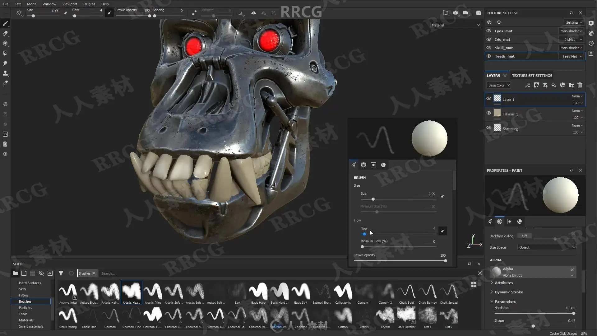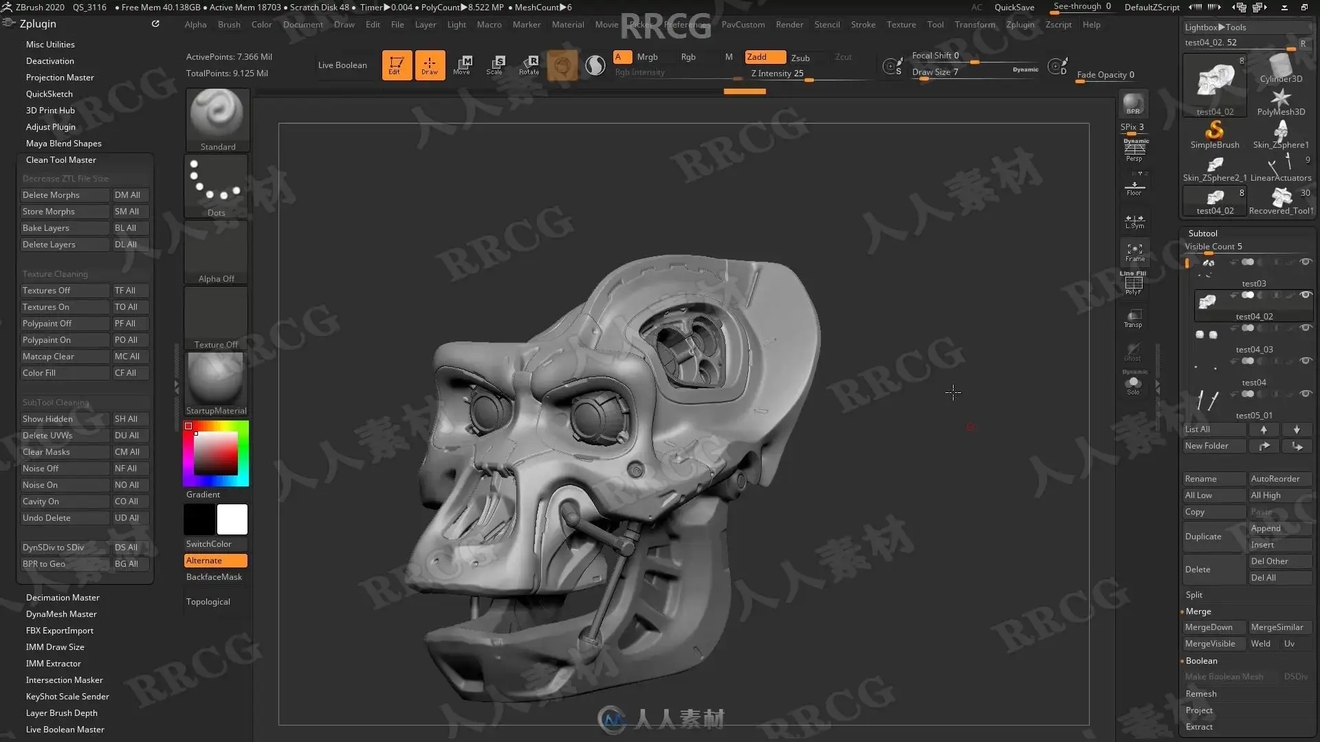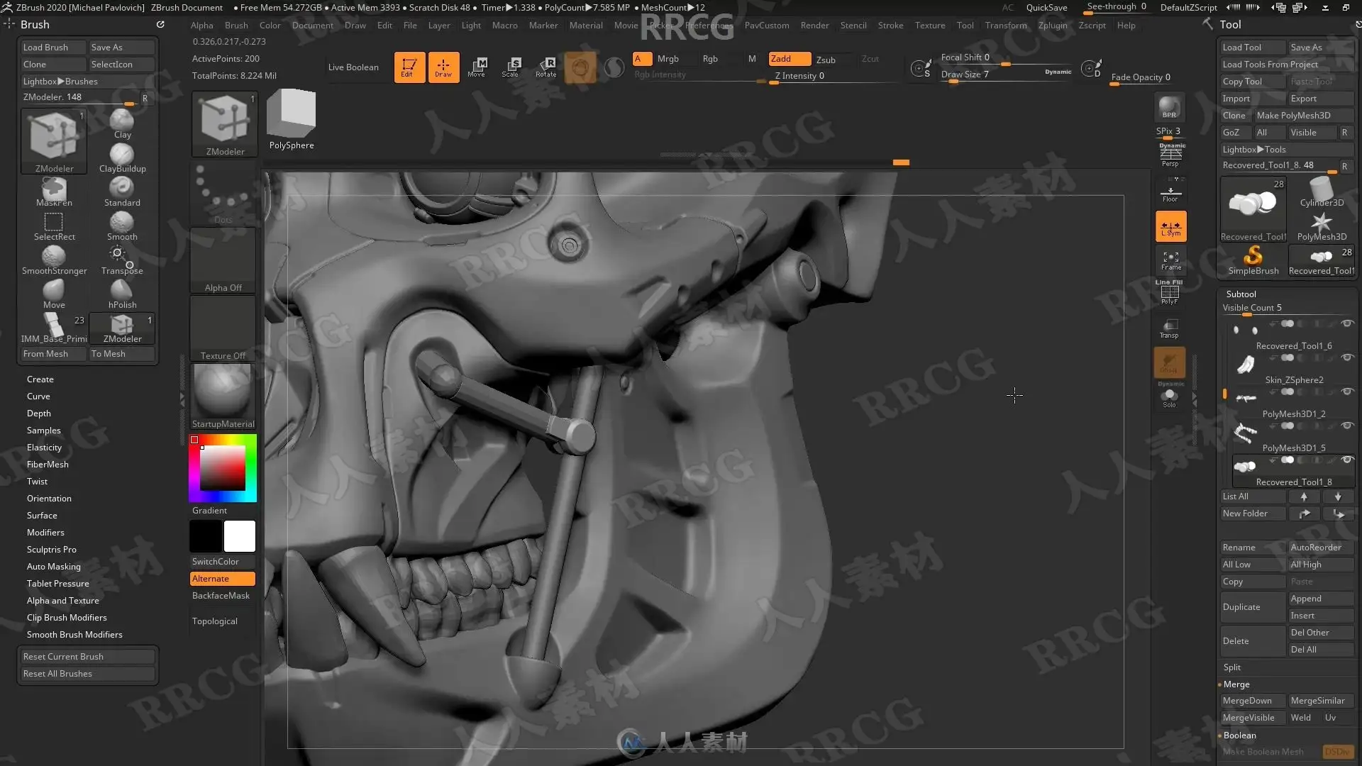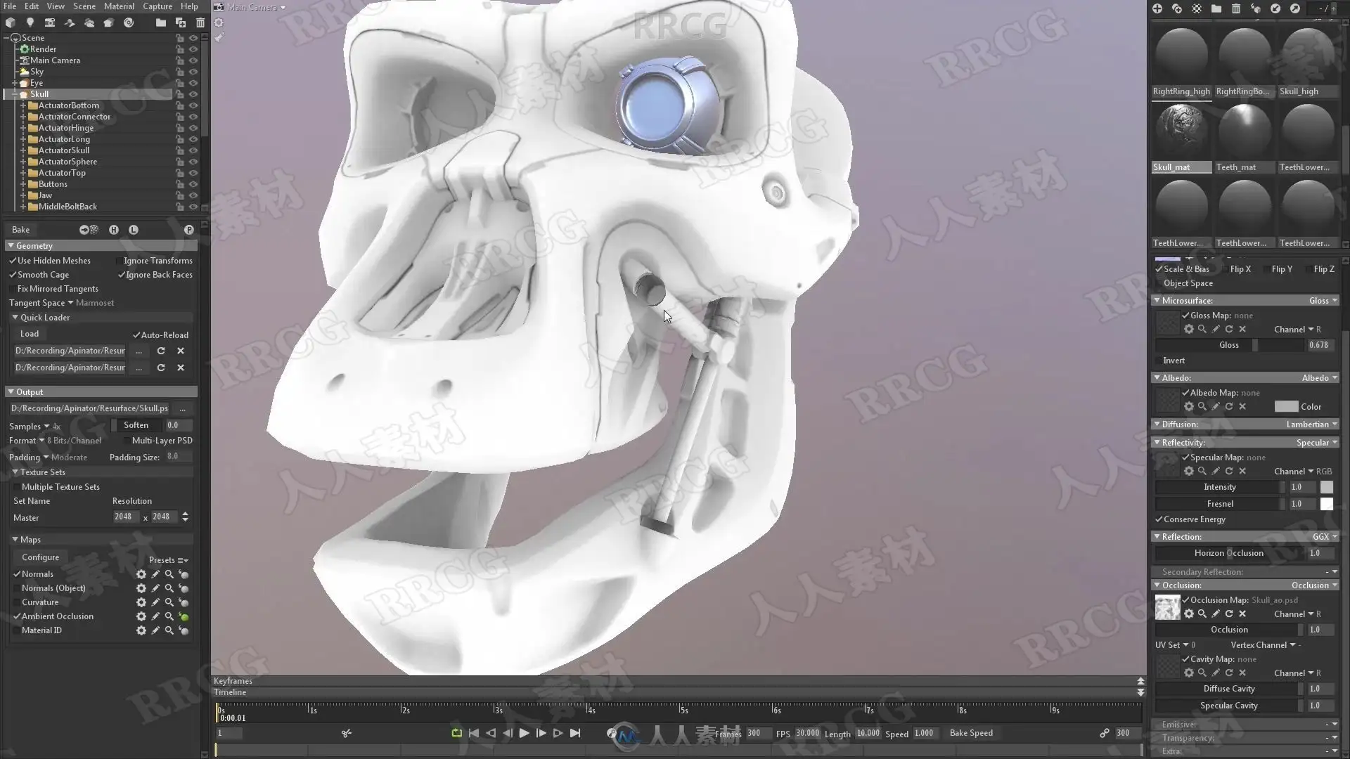 本教程是关于机械头骨数字雕刻建模完整制作流程视频教程,时长:13小时,大小:6.7 GB,MP4高清视频格式,教程使用软件:Zbrush,Maya,Substance Painter,Marmoset等,附源文件,作者:Michael Pavlovich,共113个章节,语言:俄语。