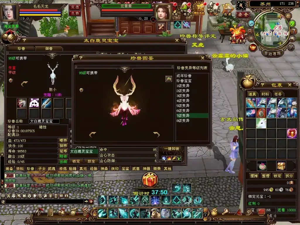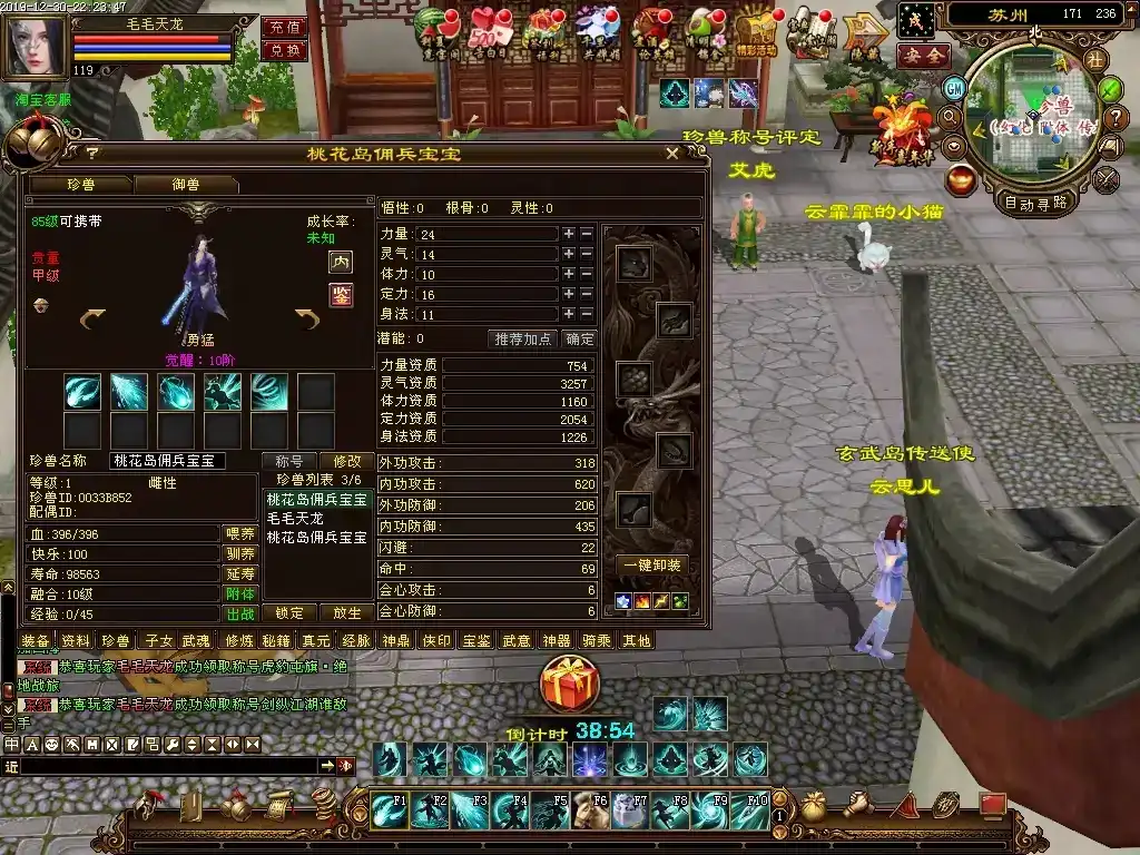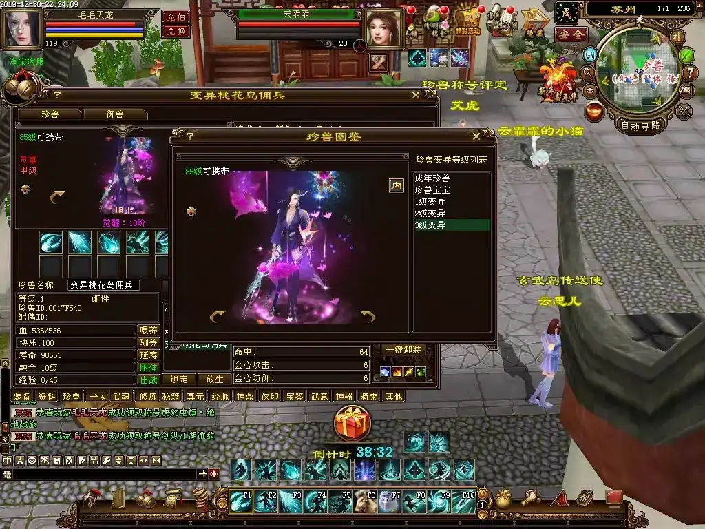 更新11∶增强了各种常见宠物的属性,提升宠物悟性的概率也提高了,后期的强力宠物在提到悟10灵10后,达到上万的资质都是正常的。玄武岛和圣兽山的怪击杀后都有几率掉落高变异等级的宠物,当然原本的单人繁殖珍兽也很好用,无需练级,两个一级的珍兽就可以无限繁殖,只要同类但性别不同就行;
